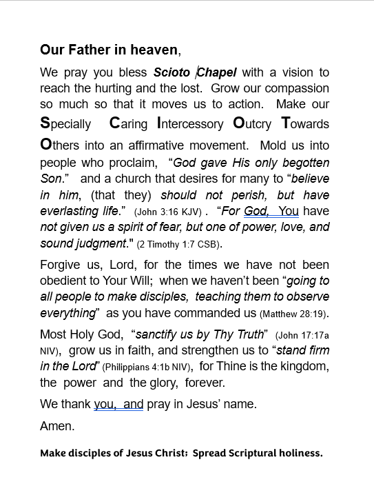 Located in Ashville, Ohio, Scioto Chapel is a warm and welcoming community of faith. As a Global Methodist Congregation, we gather to worship, learn, and grow in our spiritual journey together. Our doors are open to everyone seeking a deeper connection with God and others.